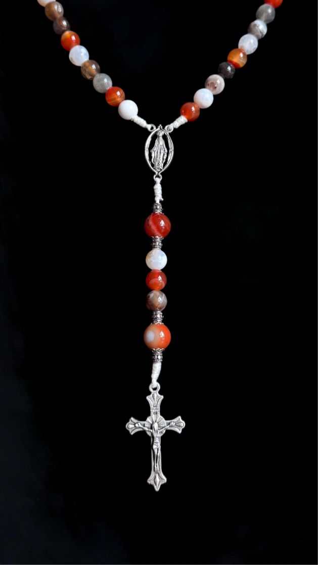 This rosary is inspired by the unwavering courage of the early Christian martyrs who, through fire and sword, chose faith over fear. The red and orange tones evoke the flames of martyrdom, while the white and translucent beads recall purity of heart and eternal light. The earthy neutrals ground the design in the reality of their human suffering — and heavenly hope.