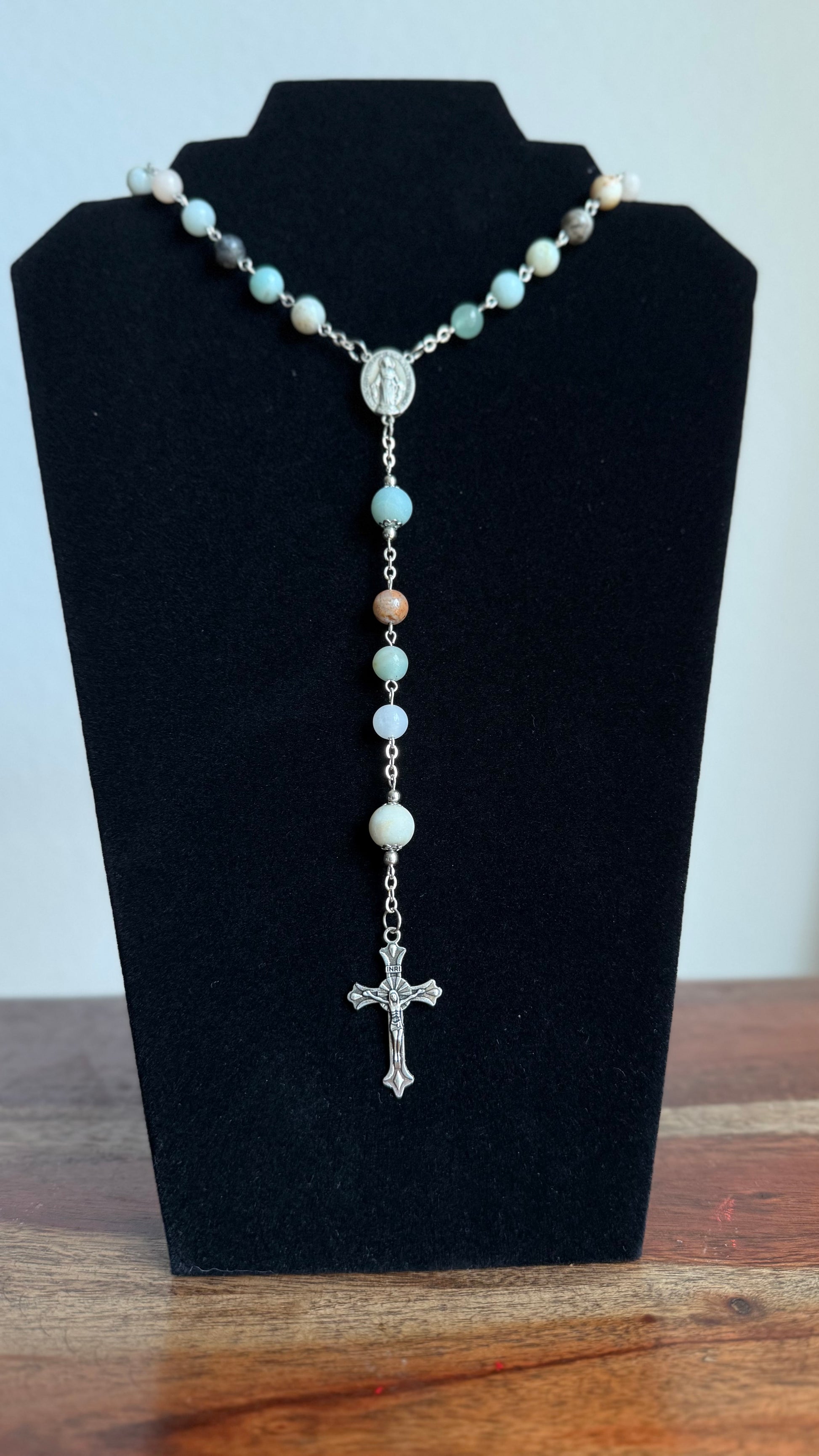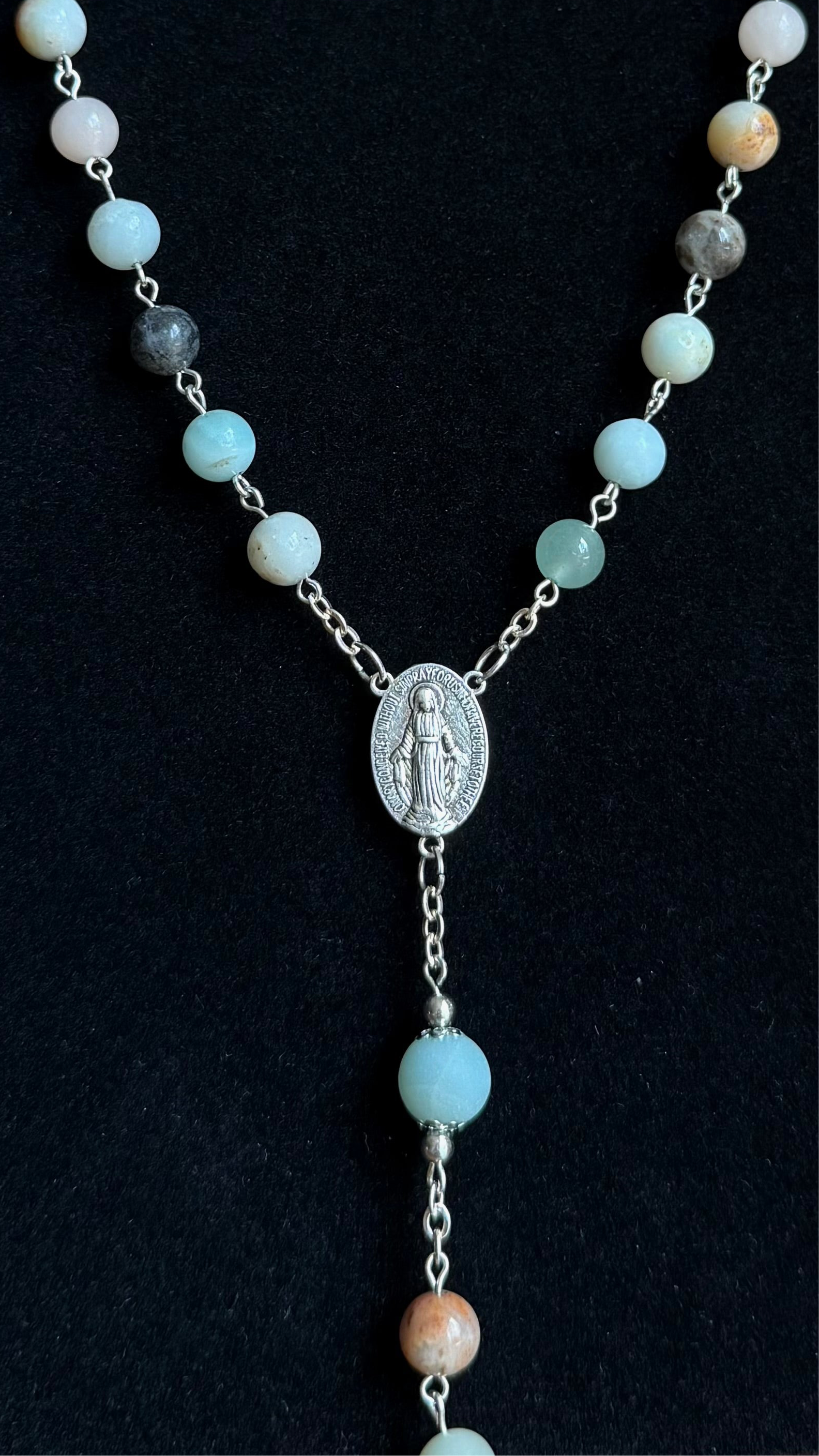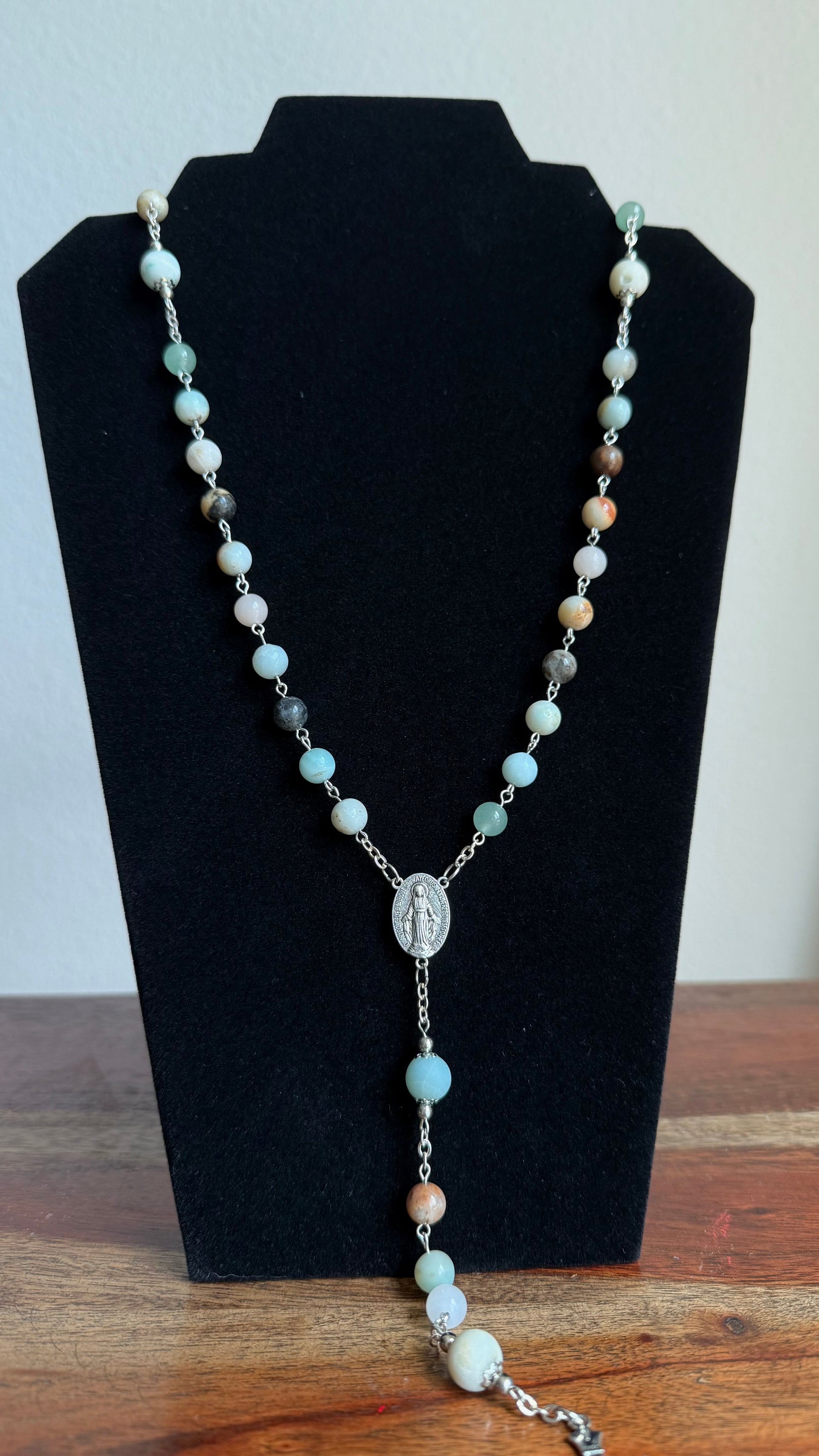 This rosary is inspired by the words of Mary at the Annunciation: “Behold, I am the handmaid of the Lord.” Its gentle tones and natural textures reflect Mary’s humility, trust, and quiet strength. The varied earthy beads symbolize the diversity of daily life — the ordinary moments made holy when offered to God with a willing heart.