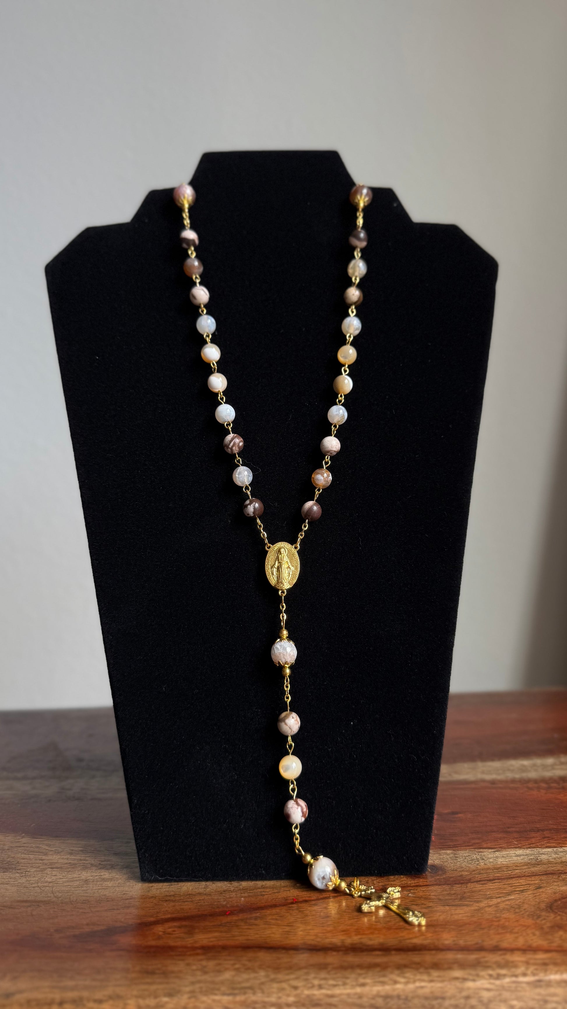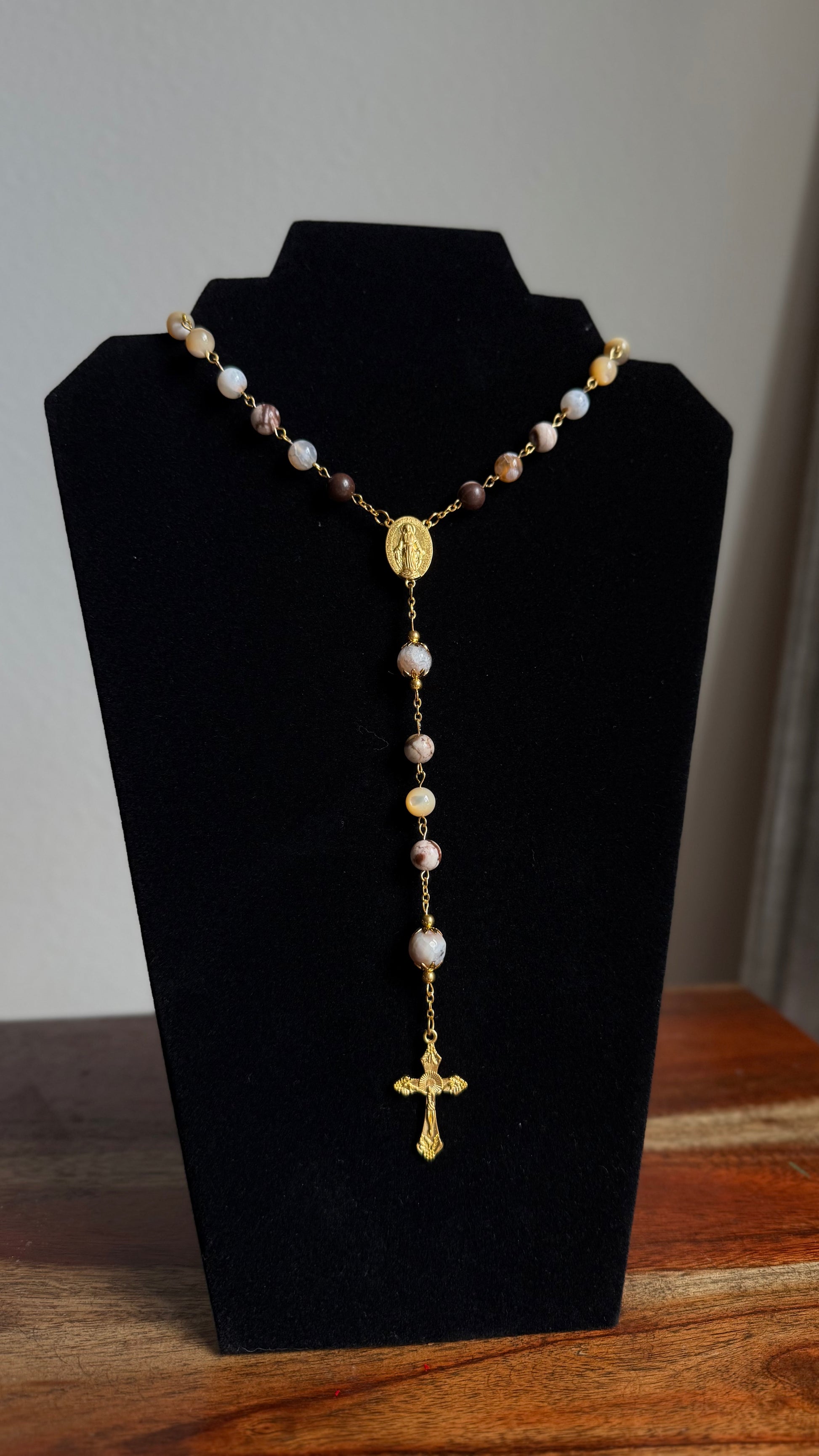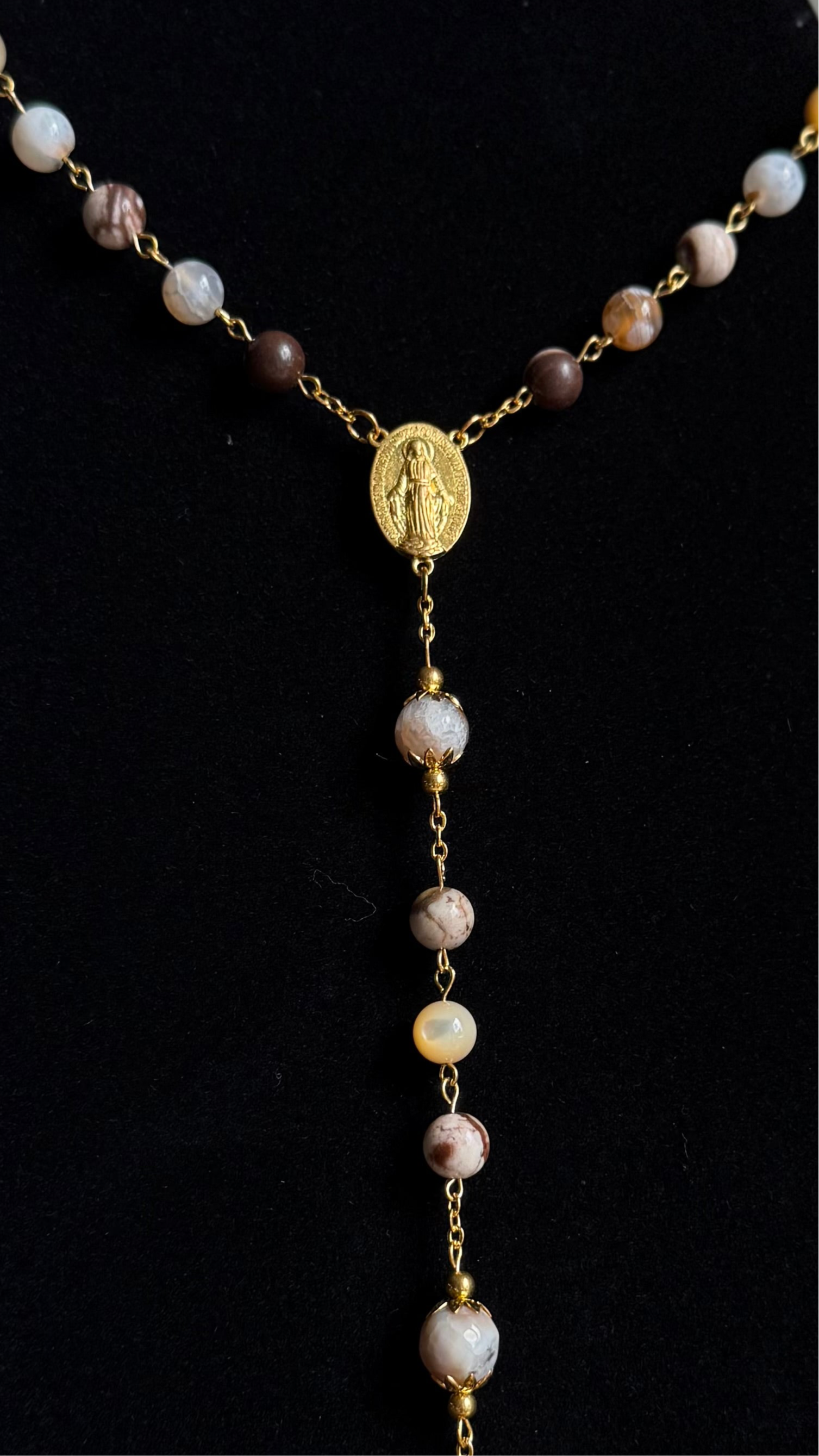 “House of Gold” is an ornate and reverent design, crafted with richly veined stone beads and golden components. Inspired by Mary as the living tabernacle of Christ, this rosary carries a sense of sacred legacy and royal grace. Blessed before shipping and prayerfully gifted — for every one sold, one is donated to someone in need.