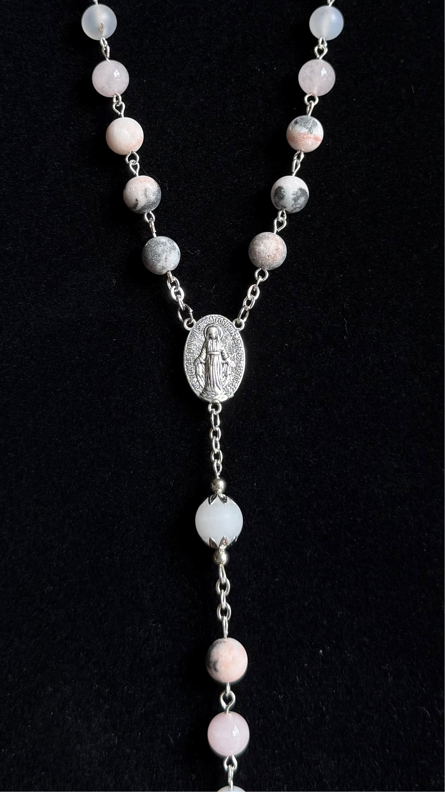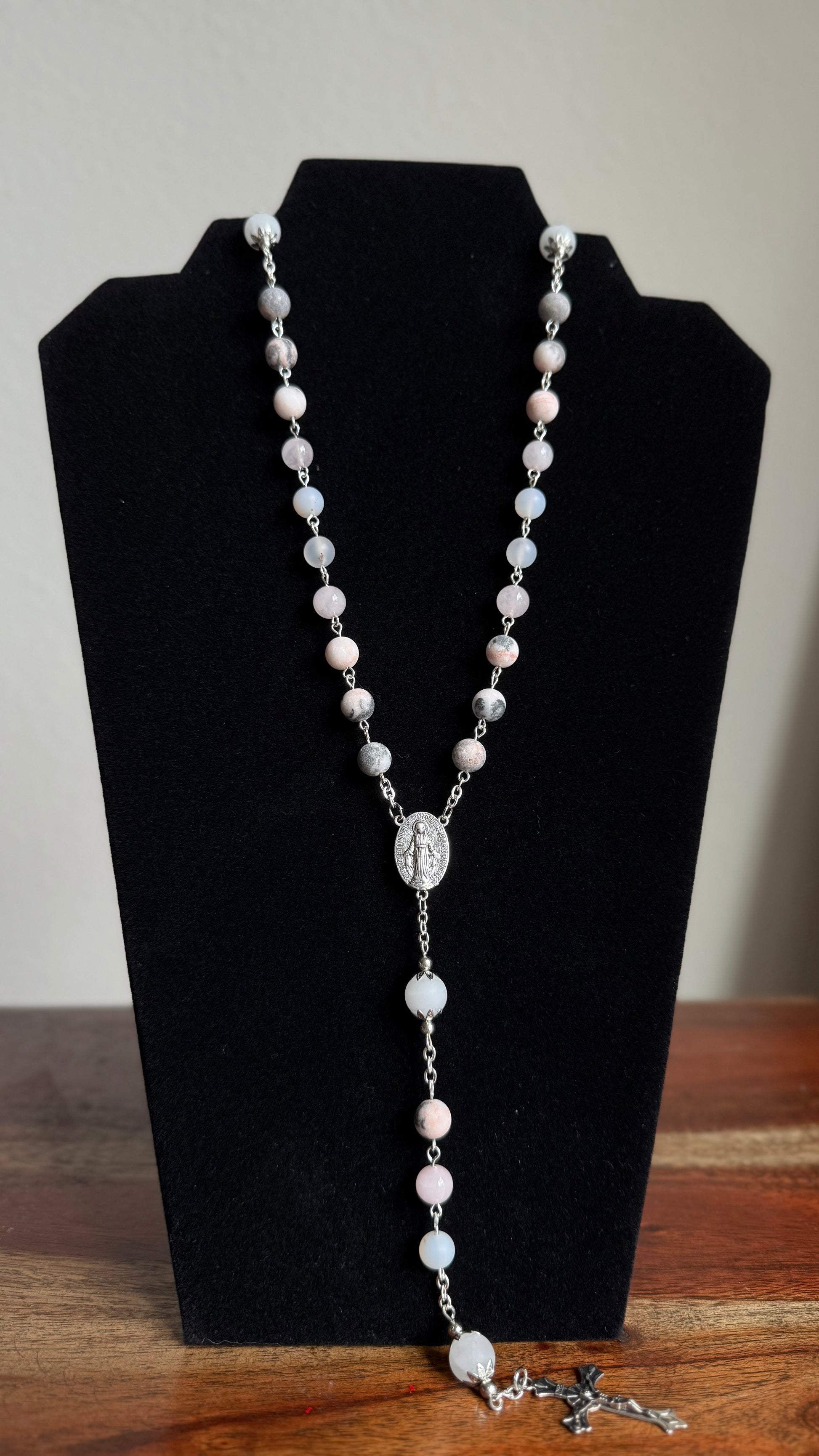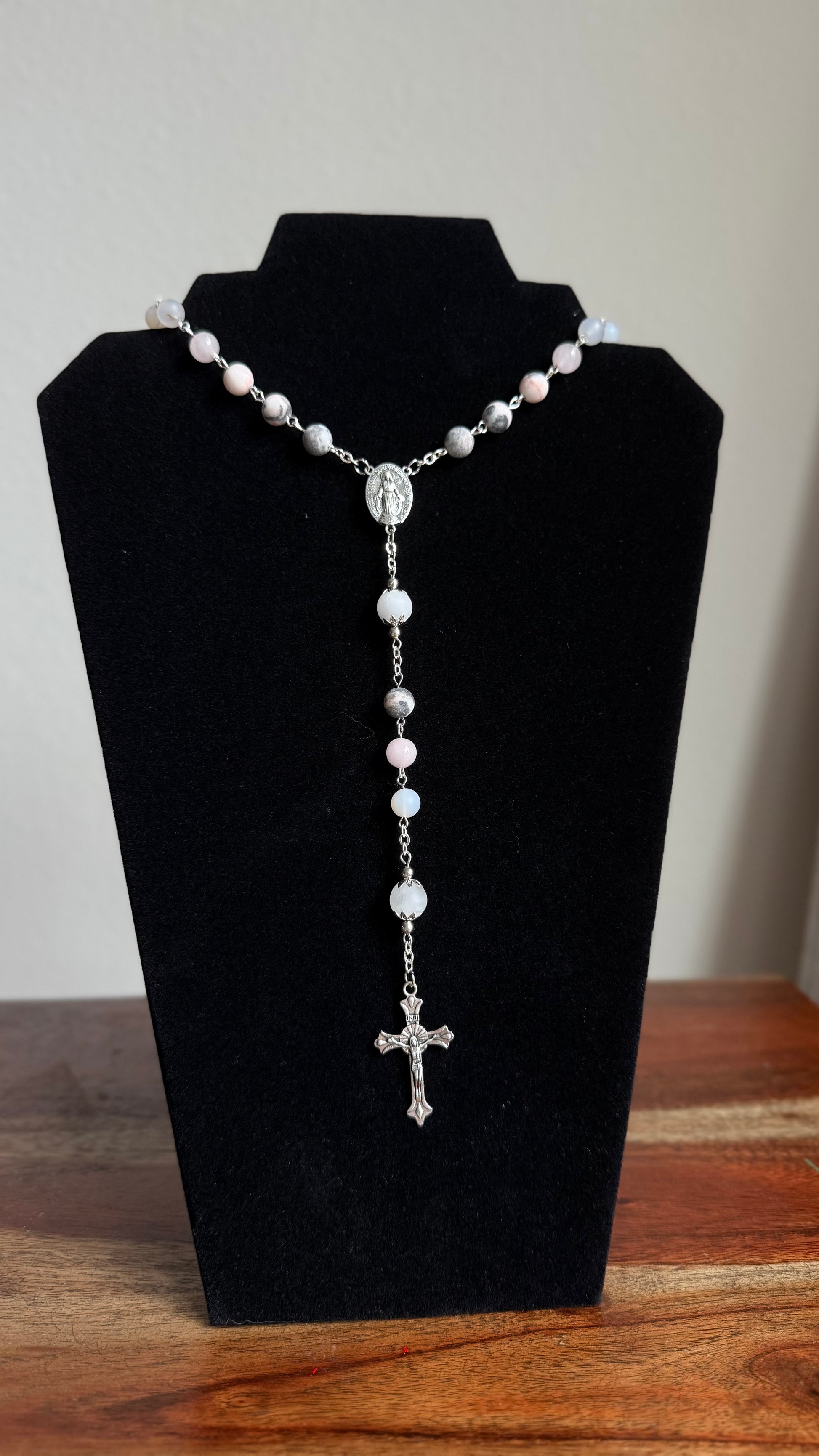 Named after one of Our Lady’s most poetic titles, “Mystical Rose” honors Mary’s beauty, sorrow, and spiritual fragrance — the hidden grace she brings to the soul. The pale pinks and soft grays reflect the balance of joy and sorrow in her heart. This rosary speaks of subtle strength, interior prayer, and redemptive love.