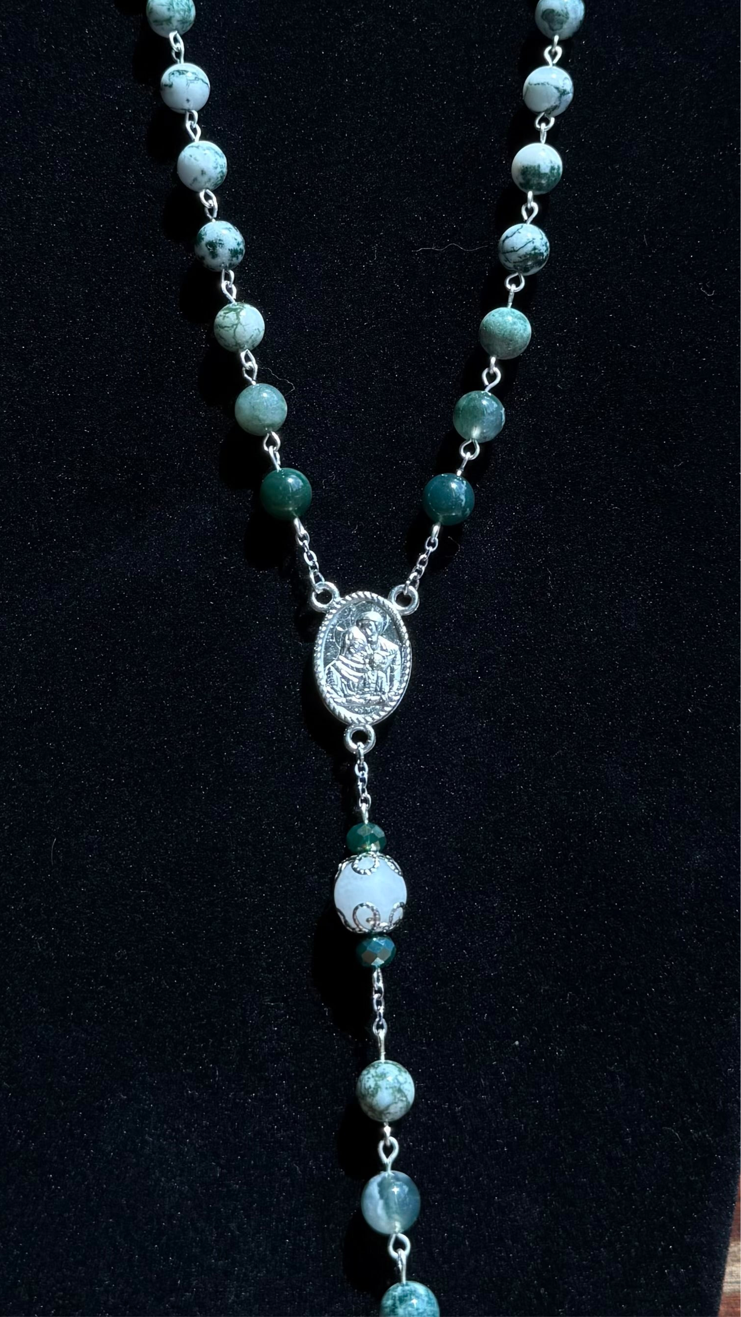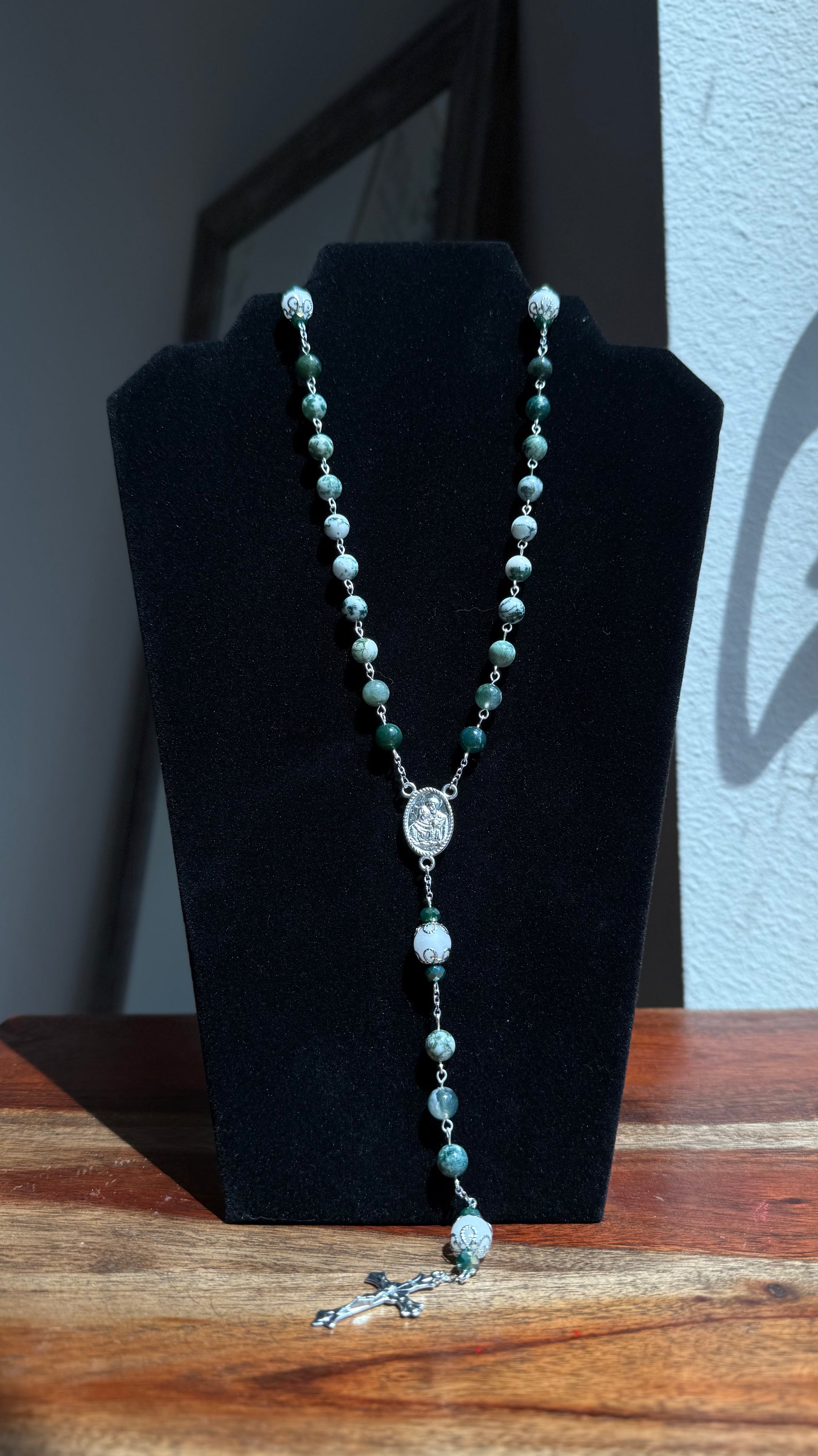 Crafted with real moss agate and hand-wired links, the “Tree of Life” rosary is rich in biblical imagery and natural beauty. Each Hail Mary bead is unique, like leaves in a forest, and the large white porcelain Our Father beads bring a soft elegance. Finished with a silver crucifix and centerpiece, this rosary is ideal for prayer walks, Lent, or anyone in need of deep spiritual roots. As always, blessed before shipping and prayerfully gifted — for every one sold, one is given away.