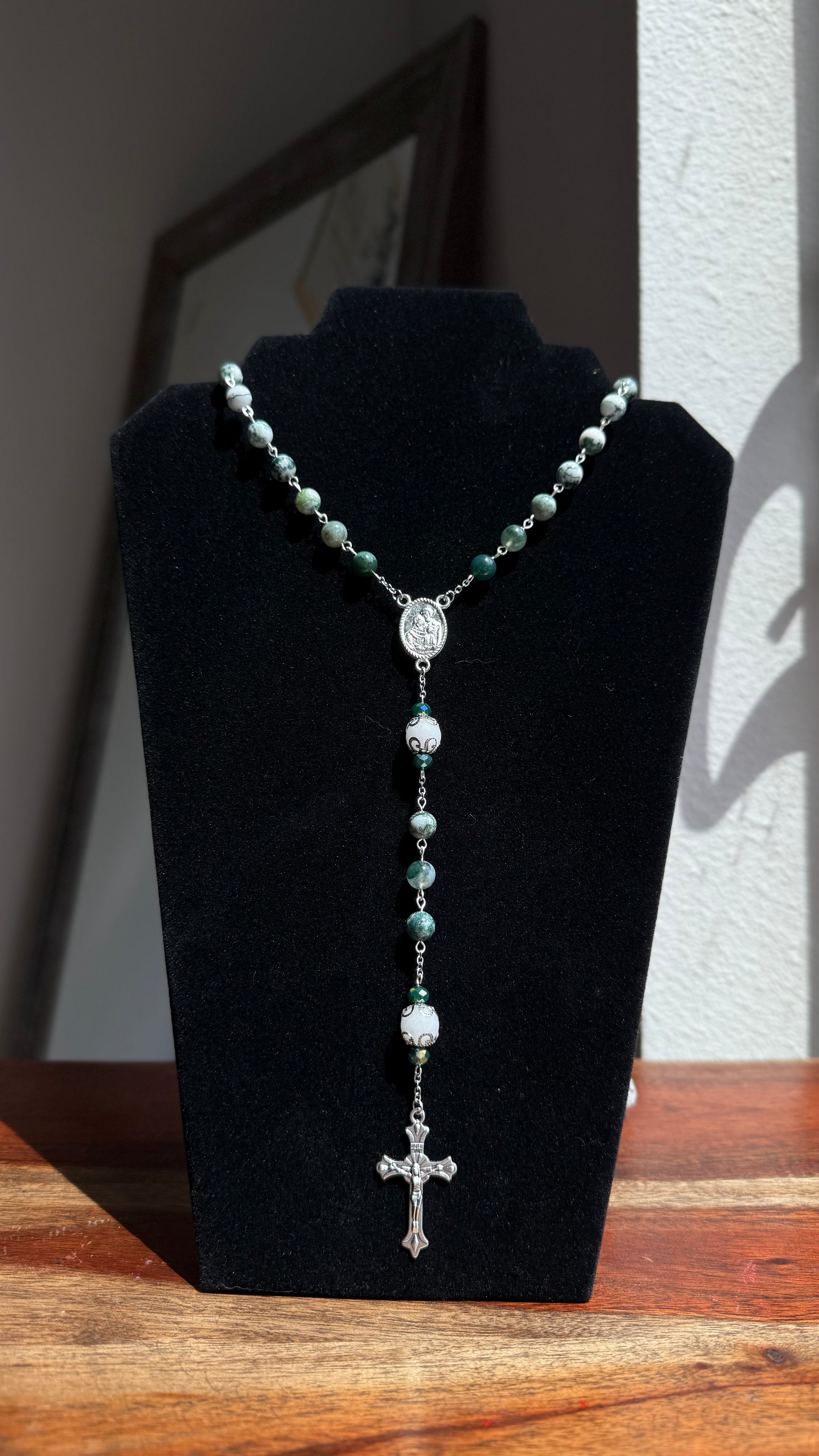 “Tree of Life” is a meditation on growth, rootedness, and divine life. The moss agate Hail Mary beads reflect creation’s quiet strength — each one like a miniature landscape. The luminous white Our Father beads suggest blossoms or fruit, encased in silver, drawing the eye toward the cross.